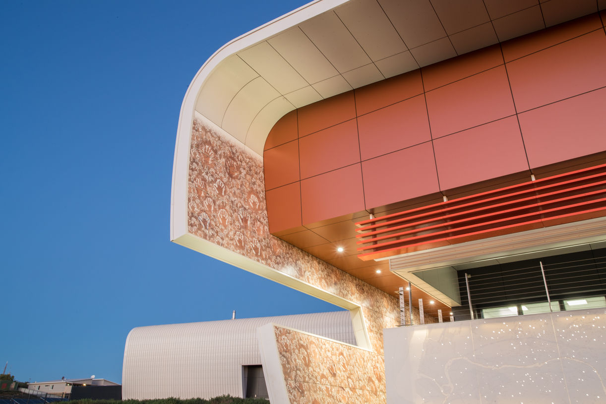 The curved roof is draped over the southern edge of the building is reminiscent of a traditional bower shelter, with the down-turn creating a surface for stencils of the hand prints provided by the community.